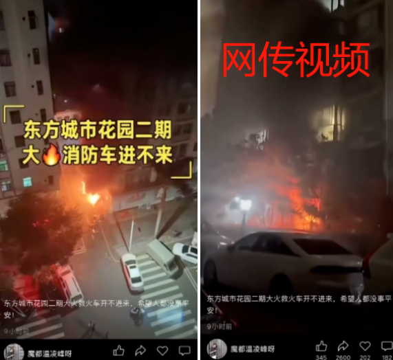 据视频号"魔都温凌峰呀"发布,"东方城市花园二期大火,消防车进不来",并配了一些小区着火视频。