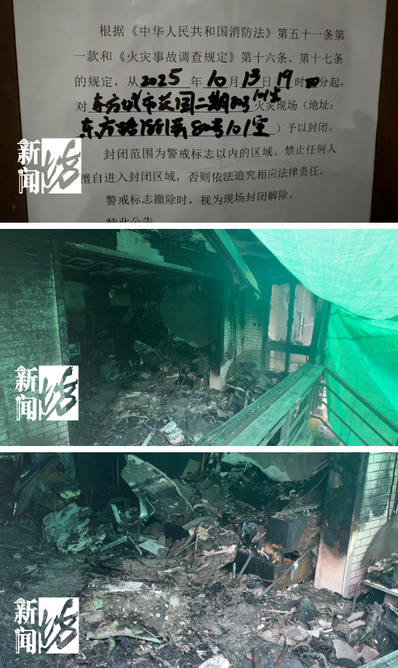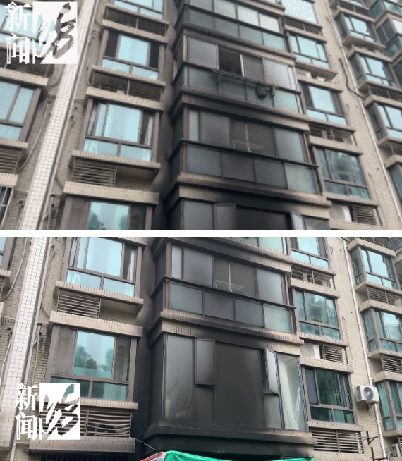记者找到80号涉事住户家的位置,只见阳台、窗户已被遮挡,外墙一片焦黑,且二楼、三楼阳台位置的外墙和玻璃也被熏黑。
