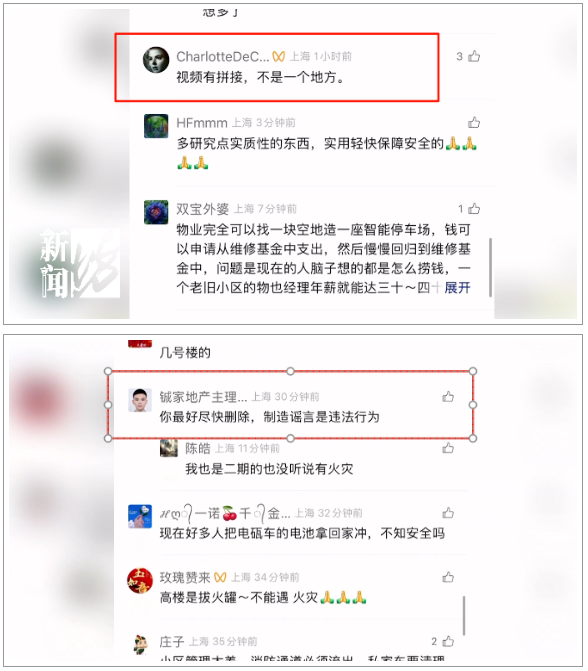 小区居民、物业及居委表示,他们发现该视频中,部分近景画面的确是小区事发时火灾视频,而视频中的远景,尤其是带有商店标牌的火灾画面,系拼接而成。