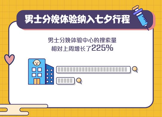 值得一提的是,男士分娩体验中心的搜索量相对上周同期增长了225%。越来越多的男性,选择通过这种方式体验女性生产的艰辛,以便在孕产期给予爱人更多的关心与爱护,更多的理解与支持。