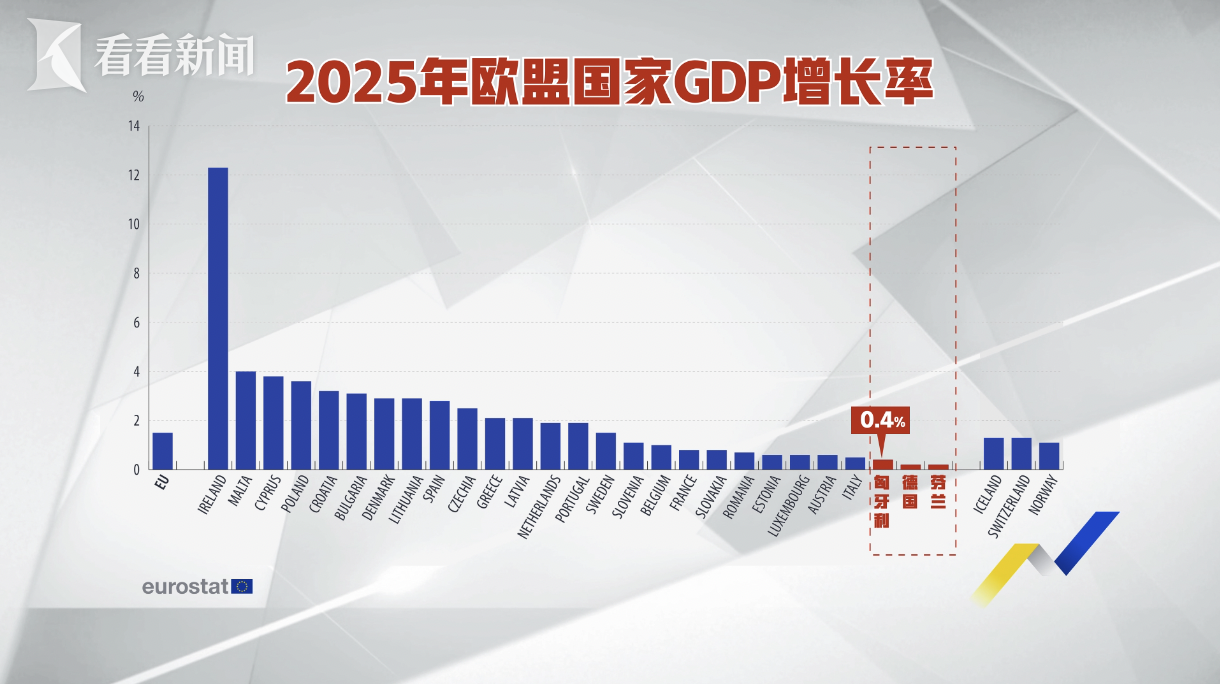 然而,这套在大国间周旋平衡的策略,没能转化为匈牙利普通民众实际获得感。过去几年,匈牙利的物价上涨了57%,是欧盟整体水平28%的两倍有余,普通人的生活成本直线上升。2025年GDP增长率仅为0.4%,在当年已公布数据的17个欧盟成员国里排倒数第三,只比深陷危机的芬兰好一点。再加上欧盟因法治争议冻结的数百亿欧元资金迟迟无法到位,更直接压缩了匈牙利的财政空间。