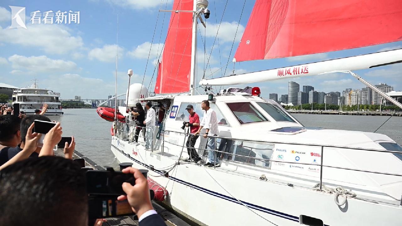 上午10点,在上海白莲泾码头,翟墨船长在众人的欢送中,登上双桅远洋帆船,码头上,人们不断挥手,目送着这艘帆船慢慢远行。