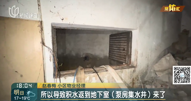 之前,在施工过程中,挖断了小区外的排污水管道,并临时安装泵抽水;由于周五暴雨,泵水管道堵塞,导致小区三幢楼房地下室水出现了倒灌,其中1号楼地势较低,最为严重。