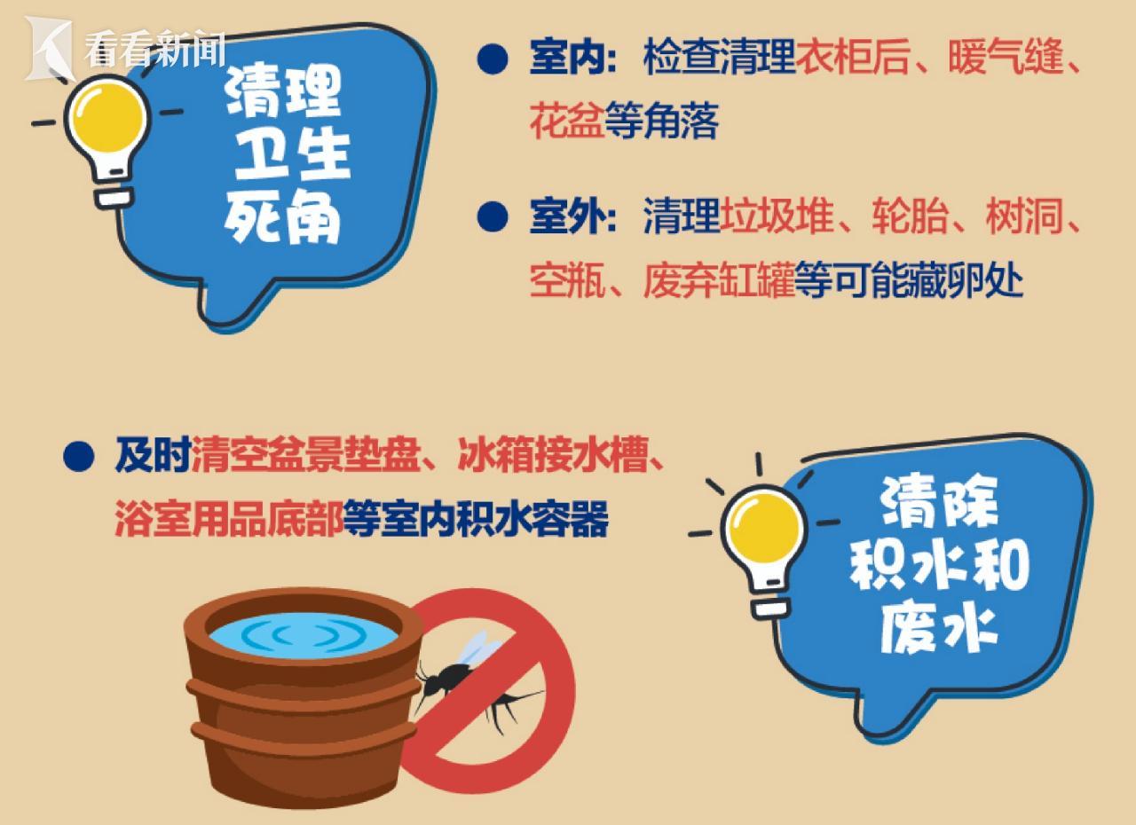 答:一是清理卫生死角。包括室内环境,检查、清理衣柜后、暖气缝、花盆等角落;楼道、院内等室外环境,垃圾堆、轮胎、树洞、空瓶、废弃缸罐等处都有可能藏匿蚊卵,即使水源干涸,有些蚊卵仍能存活,所以角落最好不留脏污。