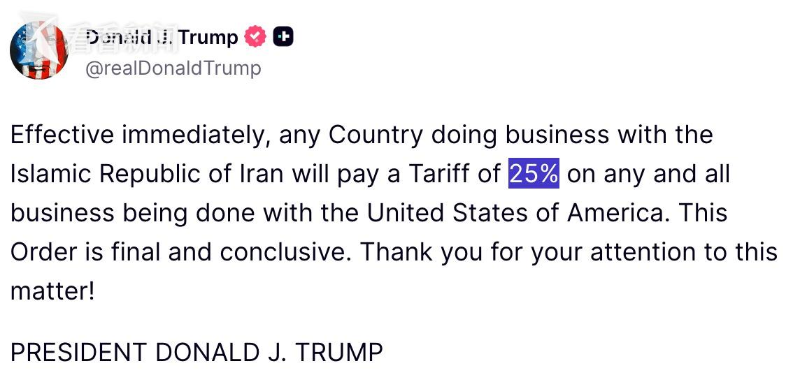 当地时间1月12日下午,美国总统特朗普在社交媒体发文称,任何与伊朗进行商业往来的国家,其与美国的所有商业往来都将面临25%的关税。