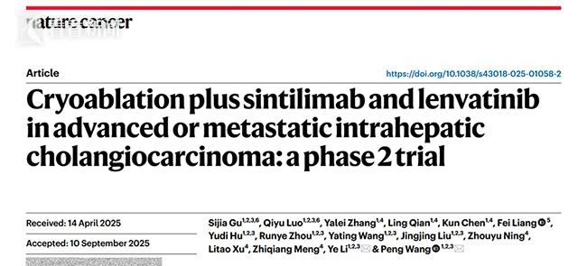 此背景下,11月2日,王鹏教授团队在《Nature Cancer》(自然-癌症)在线发表了题为“冷冻消融联合信迪利单抗和仑伐替尼治疗晚期/转移性肝内胆管癌”的Ⅱ期临床研究结果。该方案针对一线治疗失败的晚期肝内胆管癌患者,将客观有效率(ORR)从既往约5%显著提升至75%,中位无进展生存期(PFS)从2-4个月提升到16.8个月,总生存期(OS)达25.4个月,且安全性良好。这一成果不仅是我国肝胆肿瘤领域原创性突破的重要体现,更为全球晚期胆管癌治疗提供了新思路。