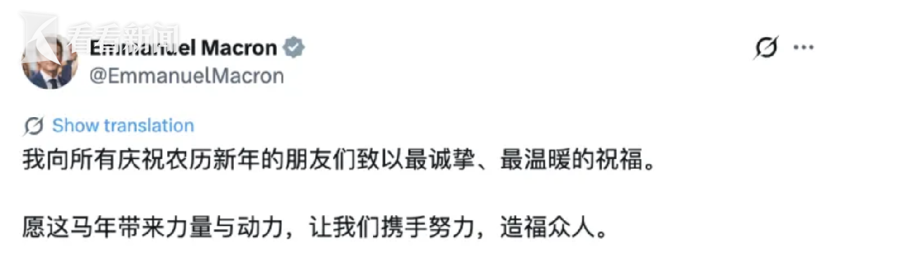 “我向所有庆祝农历新年的朋友们致以最诚挚、最温暖的祝福。愿这马年带来力量与动力,让我们携手努力,造福众人。”马克龙用中文写道。