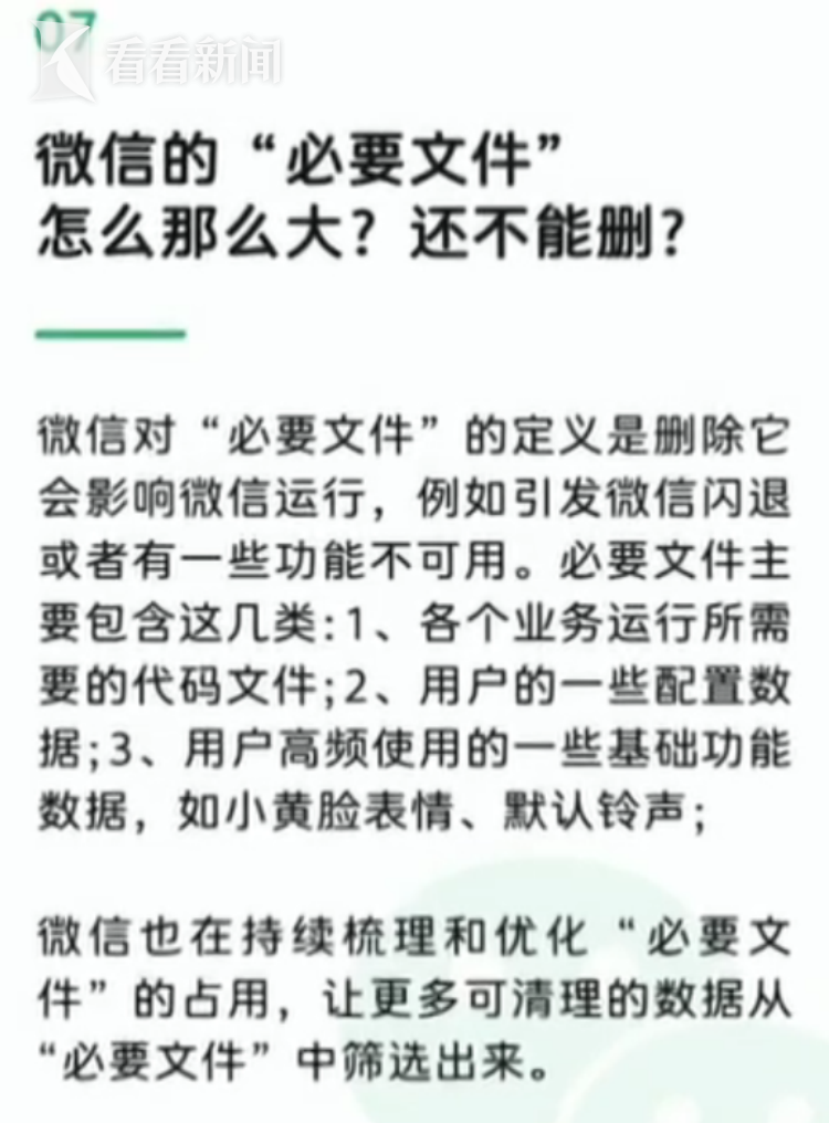 微信官方承认,随着功能的不断丰富,安装包越来越大是一个客观情况。微信也在持续梳理和优化“必要文件”的占用,让更多可清理的数据从“必要文件”中筛选出来,删掉不影响使用。而这里的必要文件指的是,删除它会影响微信运行,如引发闪退或者有一些功能不可用的文件。