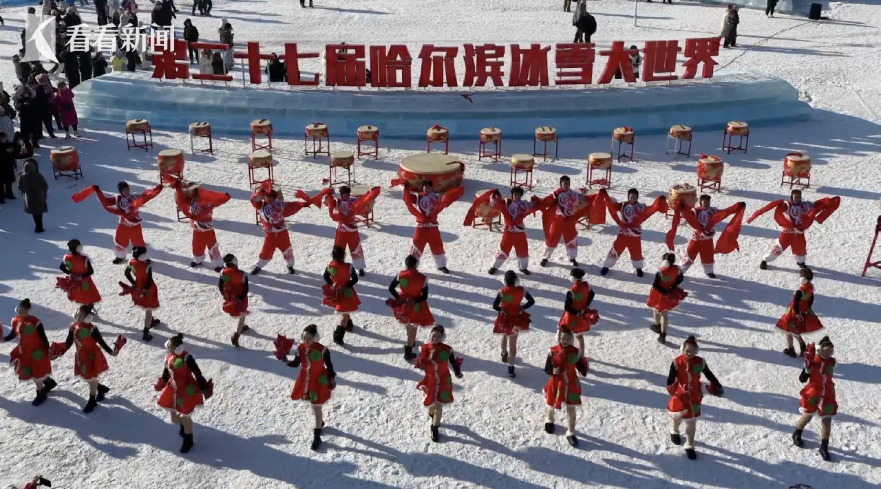 入口处,景区为游客献上威风锣鼓和《大东北》舞蹈表演,将冰城的热情传递给每位游客。场地内的红色大鼓,也成为新晋打卡地,游客们敲响大鼓,许下美好心愿。