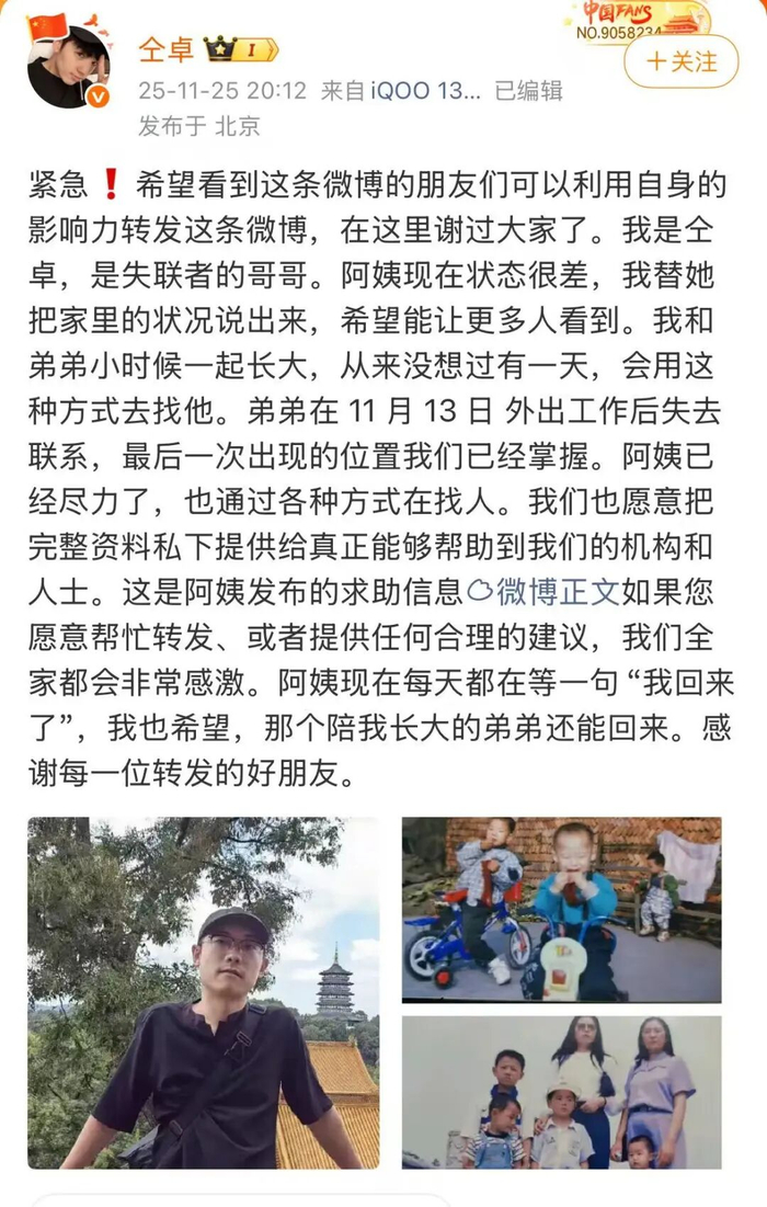 11月25日晚,演员仝卓在社交媒体上发布求助信息,称其表弟李怡亨在外出工作后失去联系。家属透露,李怡亨可能遭遇跨国诱骗,疑似“被控制”。