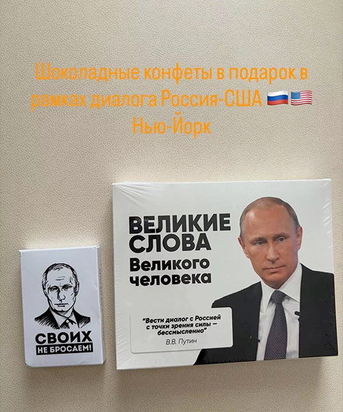 当地时间10月25日,负责与外国投资和经济合作事务的俄罗斯总统特别代表、俄直接投资基金总裁德米特里耶夫在社交媒体上表示,他向美方赠送了两盒印有俄罗斯总统普京形象及其语录的巧克力作为礼物。报道称,德米特里耶夫在社交媒体上发布了一张巧克力的照片,并配文:“巧克力作为俄美对话的礼物。纽约。”