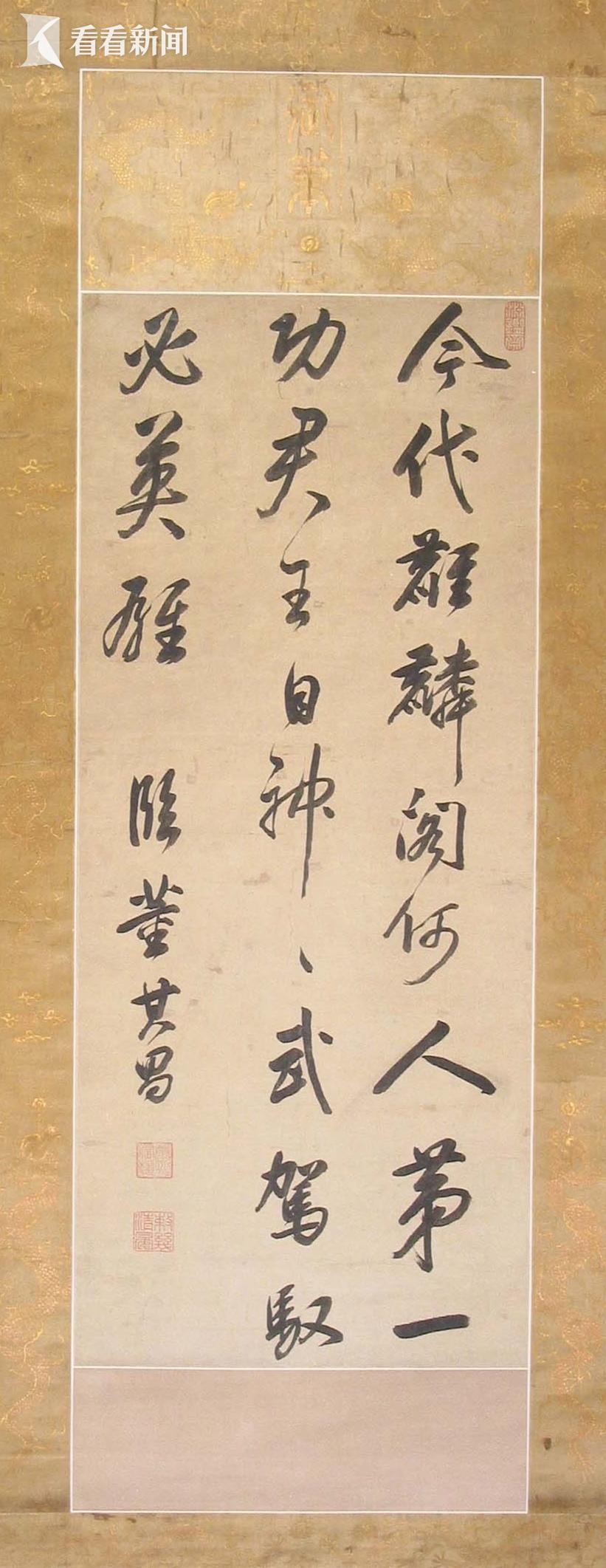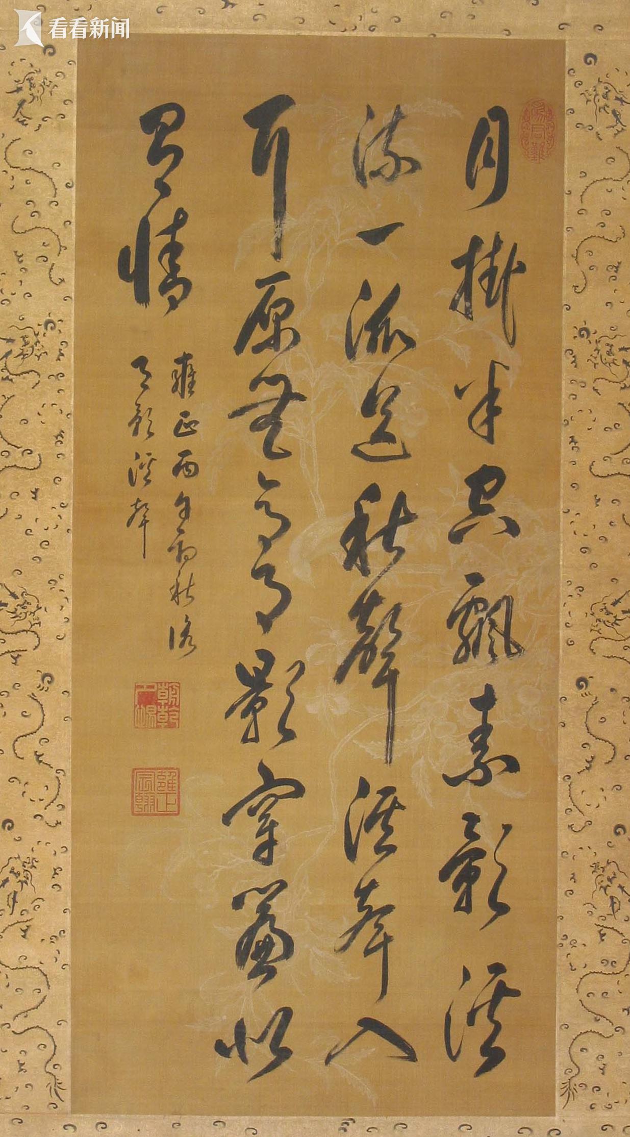 清朝迁都北京后,统治者崇文重道,学习中原汉文化,尊尚传统典章制度。皇帝耽习艺文书画,引领朝野崇文之风。康熙皇帝的字主要师法明代董其昌,不论是结构还是用笔,都大气磅礴,以骨力取胜,达到了相当的水准,并直接影响和引领了当时的书风走向,使清初书坛弥漫着董派的流风余韵。雍正皇帝书法畅朗娴熟、文雅遒劲,行笔疾迟有序,气脉贯通。乾隆皇帝在学画的道路上转向了注重“古意”而在写实功力上可以适当放松要求的“文人画”。《玄烨临董其昌行书诗轴》《胤禛丙午年行书诗轴》《弘历墨笔古木林石图轴》,均在本次展览中展出。
