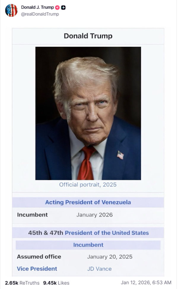 当地时间1月11日,美国总统特朗普在社交媒体上发布了关于其当前身份介绍的博文。相关内容显示,特朗普现为“委内瑞拉代总统”,上任时间为2026年1月。