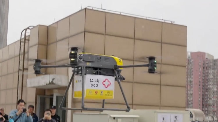 上午9点,“仁济001号”无人机运载着医疗检验样本,从东院9号楼楼顶起飞,飞往14.5公里外的南院。