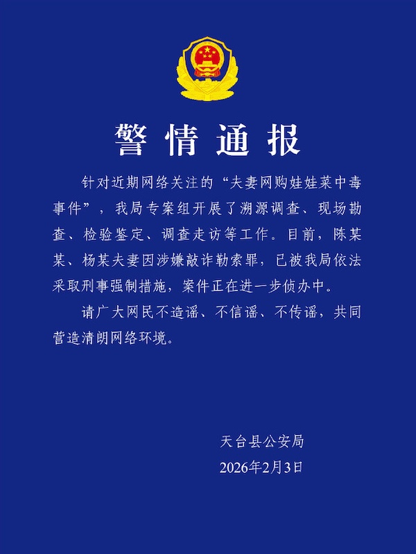 夫妻俩给自己下毒?浙江天台县公安局最新通报"夫妻网购娃娃菜中毒事件"!陈某某、杨某夫妻因涉嫌敲诈勒索罪,被依法采取刑事强制措施。