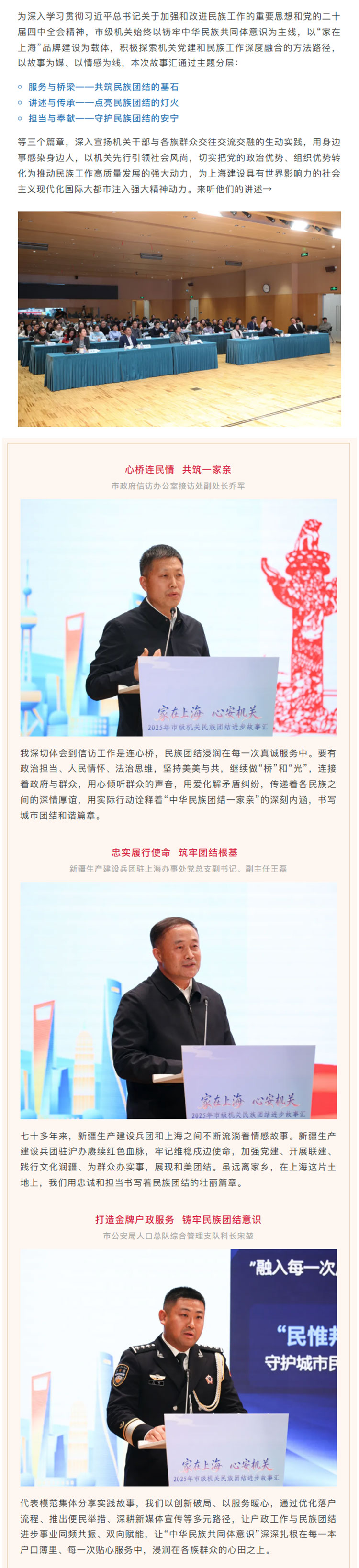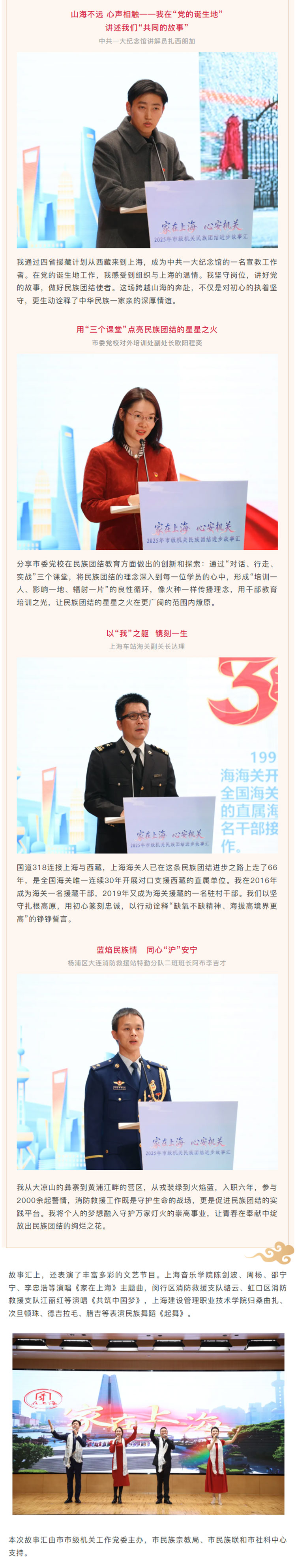 12月22日,市市级机关工作党委举办“家在上海 心安机关”2025年市级机关民族团结进步故事汇。市市级机关工作党委副书记田霞出席并致辞,市民族宗教局副局长毛俊出席并颁发“市级机关民族团结进步故事宣讲员”证书。市委统战部民宗处、市民族宗教局民族一处、市民族联和市级机关各单位统战工作职能部门负责人等110多人参加。