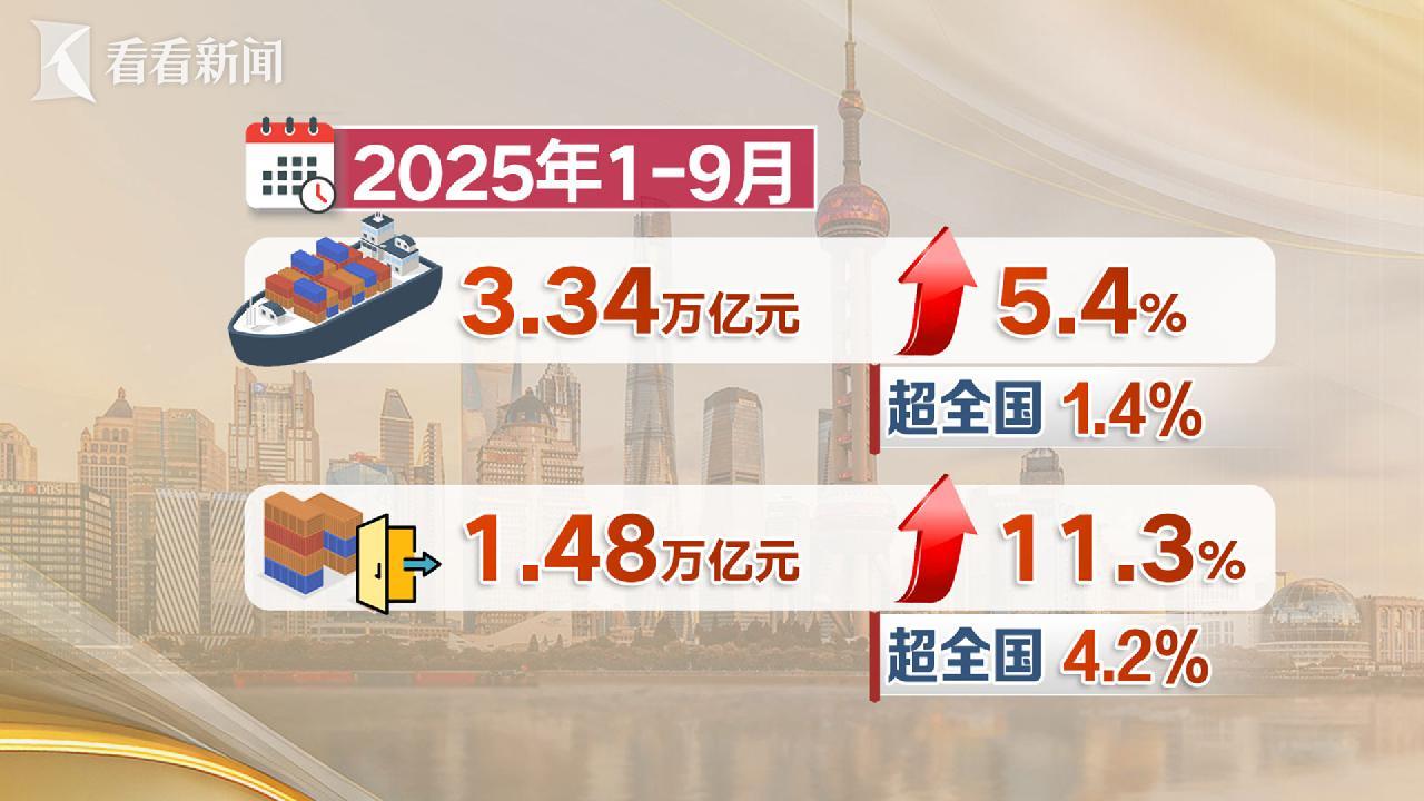 前三季度,上海进出口达3.34万亿元,同比增长5.4%,增速由开局落后全国,转为反超1.4个百分点。其中,出口是主要动力,前三季度同比增长超11%,增速高出全国4.2个百分点。