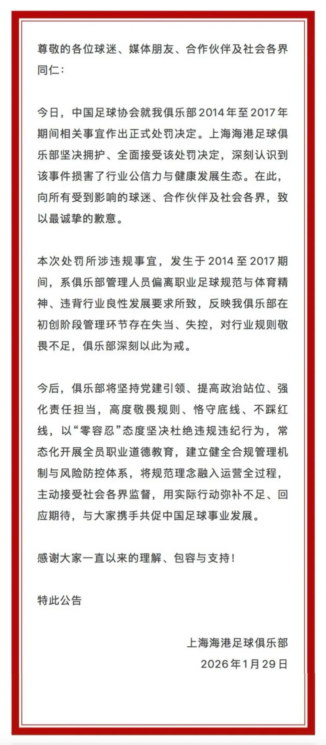 1月29日上午,公安部、体育总局、中国足协联合召开足球行业“假赌黑”问题专项整治行动新闻发布会,对涉案者做出处罚通知。上海市足球协会坚决拥护所有相关决定,我们将在下阶段积极督促并协同上海申花和海港足球俱乐部理好旧账,接受处罚决定。同时引以为戒,在后续的训练比赛过程中,坚决杜绝违规违纪行为,积极践行体育精神。