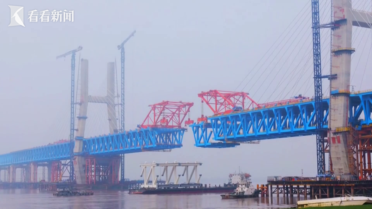 日前,随着钢梁A38'A39'节段与A36'A37’节段实现精准对接,大桥主桥南北“相握”只剩下65.5米。崇启公铁长江大桥主通航孔桥为双塔双索面钢桁结合梁斜拉桥,主跨400米,钢桁梁总长992米,总重量约3.6万吨,采取边跨拖拉、中跨单悬臂架设的施工方案,主通航孔桥共需架设13个节段钢梁,最重节段为918.4吨。目前,大桥建设总进度已完成88%,建设者们正奋战在大桥钢梁架设、斜拉索挂设、公路桥面板钢筋焊接等关键点位,为即将到来的主桥合龙做最后冲刺。