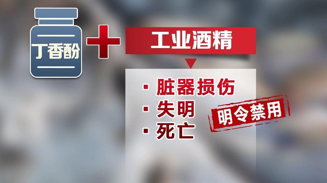 而由于丁香酚不溶于水,有商家为让麻醉剂快速渗透、起效,甚至用工业酒精勾兑。工业酒精含有剧毒的甲醇,直接食用可致人失明、脏器损伤,甚至死亡,是我国明令禁止用于食品领域的。