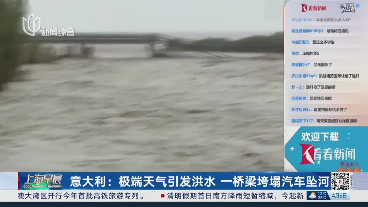 意大利:极端天气引发洪水 一桥梁垮塌汽车坠河