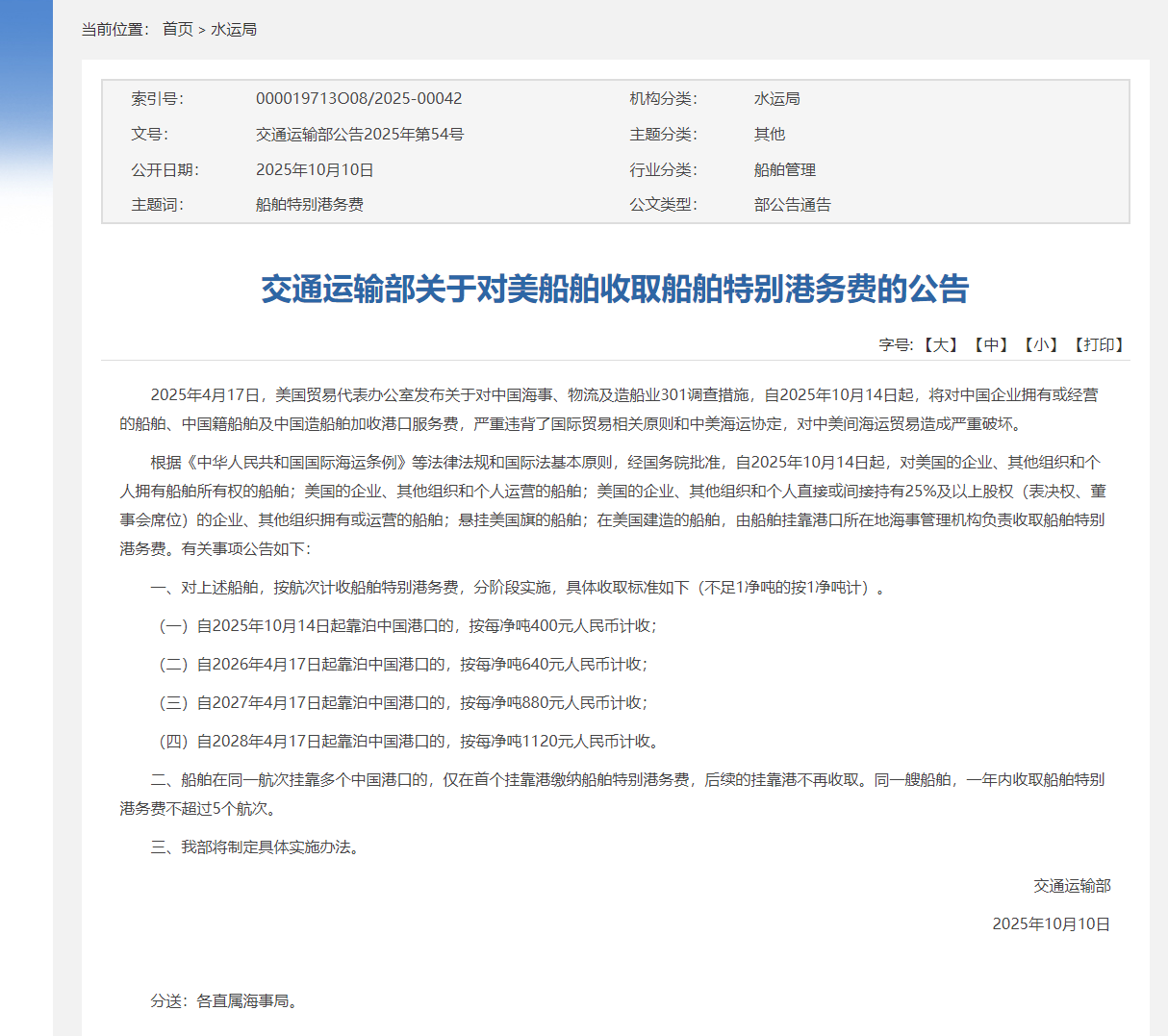 根据《中华人民共和国国际海运条例》等法律法规和国际法基本原则,经国务院批准,自2025年10月14日起,对美国的企业、其他组织和个人拥有船舶所有权的船舶;美国的企业、其他组织和个人运营的船舶;美国的企业、其他组织和个人直接或间接持有25%及以上股权(表决权、董事会席位)的企业、其他组织拥有或运营的船舶;悬挂美国旗的船舶;在美国建造的船舶,由船舶挂靠港口所在地海事管理机构负责收取船舶特别港务费。有关事项公告如下: