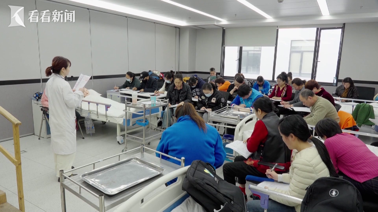在杨浦区的一家护理员培训学校,周末的课堂座无虚席。上百名学员带着行李箱从全国各地赶来,一下火车便直奔课堂,学习热情高涨。