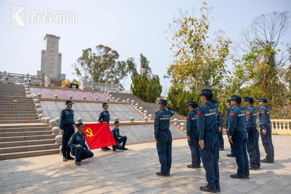 在位于海南万宁的六连岭革命烈士陵园,琼海海警局万宁第二工作站的执法员们面向烈士纪念碑庄严肃立,脱帽、低头默哀,深切缅怀革命先烈。随后,面向鲜红的党旗,全体执法员举起右拳,重温入党誓词,表达不忘初心、牢记使命的坚定信念。