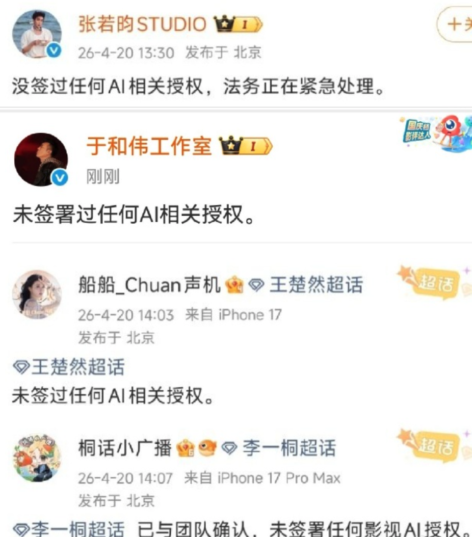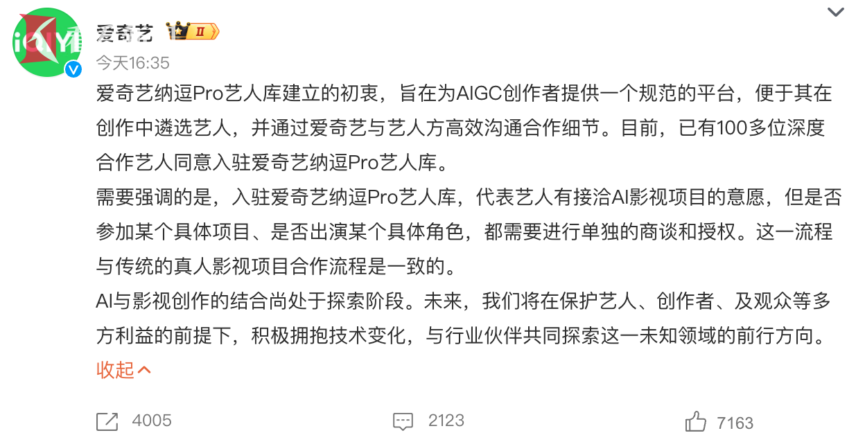 今天(4月20日),爱奇艺“纳逗proAI艺人库”在线翻车。“爱奇艺疯了”词条迅速登上微博热搜第一。张若昀、于和伟等多位艺人工作室迅速否认:没签过任何AI相关授权……下午,@爱奇艺 微博号回应称,“纳逗Pro艺人库建立的初衷,旨在为AIGC创作者提供一个规范的平台,便于其在创作中遴选艺人,并通过爱奇艺与艺人方高效沟通合作细节……”入库代表艺人有接洽AI影视项目的意愿,但合作细节都需要进行单独的商谈和授权。