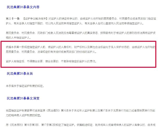 当时我们也翻了《民法典》,是有很清晰的法条的,被监护人如果没有规定指定监护人前,如果他的人身权利或者财产权利处于无人保护状态下,由被监护人住所地的居民委员会,或者是民政部门来担任临时监护人。她人是住在长桥,按照《民法典》法条来看的话,长桥的居委会完全是可以担任临时监护人,帮她应急临时去处理这样事情的。