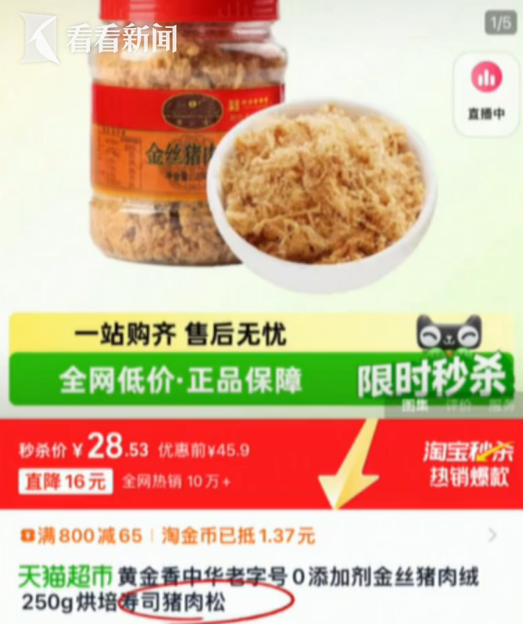 例如,在某电商平台有售的,一款名为黄金香老字号招牌金丝猪肉绒的产品中,打着肉松的宣传,配料表却显示含有豌豆粉。