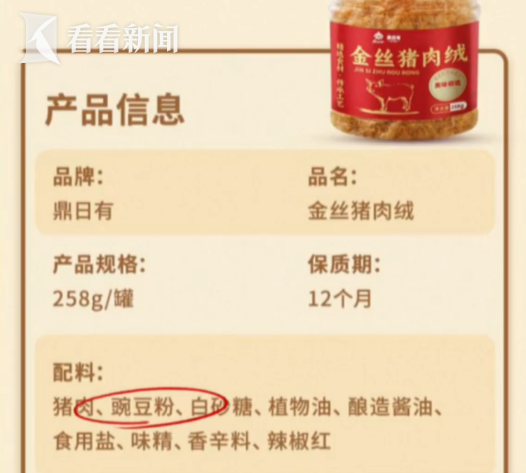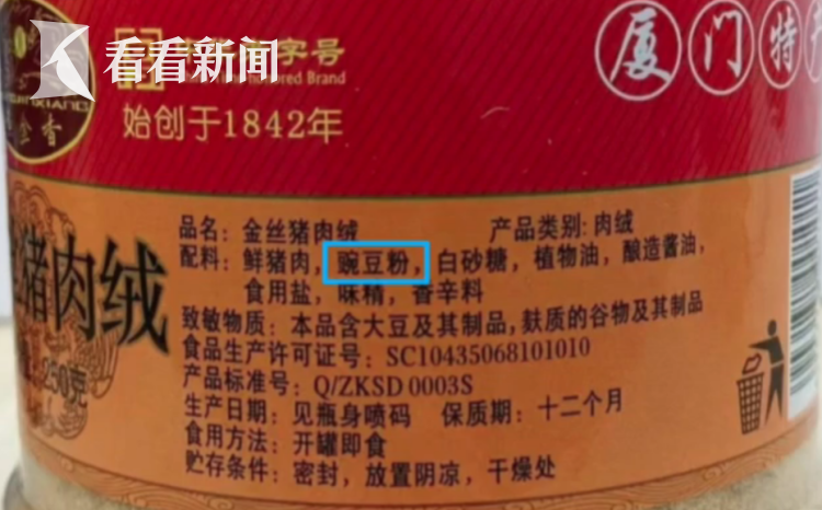 同样,另一家老字号产品的金丝猪肉绒中,也是以肉松为名,实际售卖的是肉粉松的产品,配料里同样有豌豆粉。