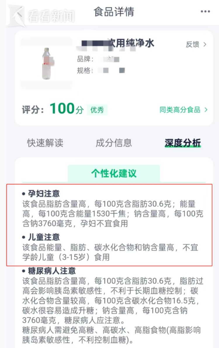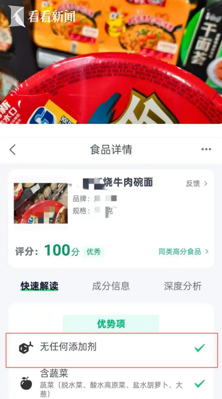 而在便捷食品区,一款常见的方便面被标注为“100分优秀”的鉴定结果,并且显示“不含有任何添加剂”。