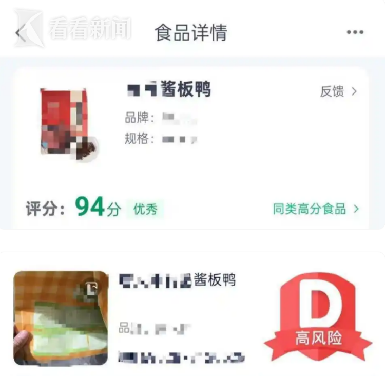 在测试某款酱板鸭的环节,多个软件给出了完全相反的结果,一款软件给出了94分的高分,并标注为“优秀”,但另一款软件则给出了高风险,不推荐食用的结论。