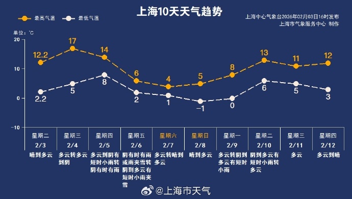 回暖只是暂时的,受高空槽影响,明天白天多云到阴并伴有短时小雨,夜里起雨势增大转阴有时有雨。周五起受强冷空气影响,申城将迎来一次雨雪天气过程,并伴有大风和降温,预计雨雪主要下在周五,全天气温在2~6℃,体感可谓是非常的湿冷。周六起天气转为晴冷,尤其是周日的早间最低气温,市区仅-1.0℃,郊区更低,有冰冻,白天最高气温也回升乏力,在4~5℃,提醒大家及时增添衣物,谨防感冒。