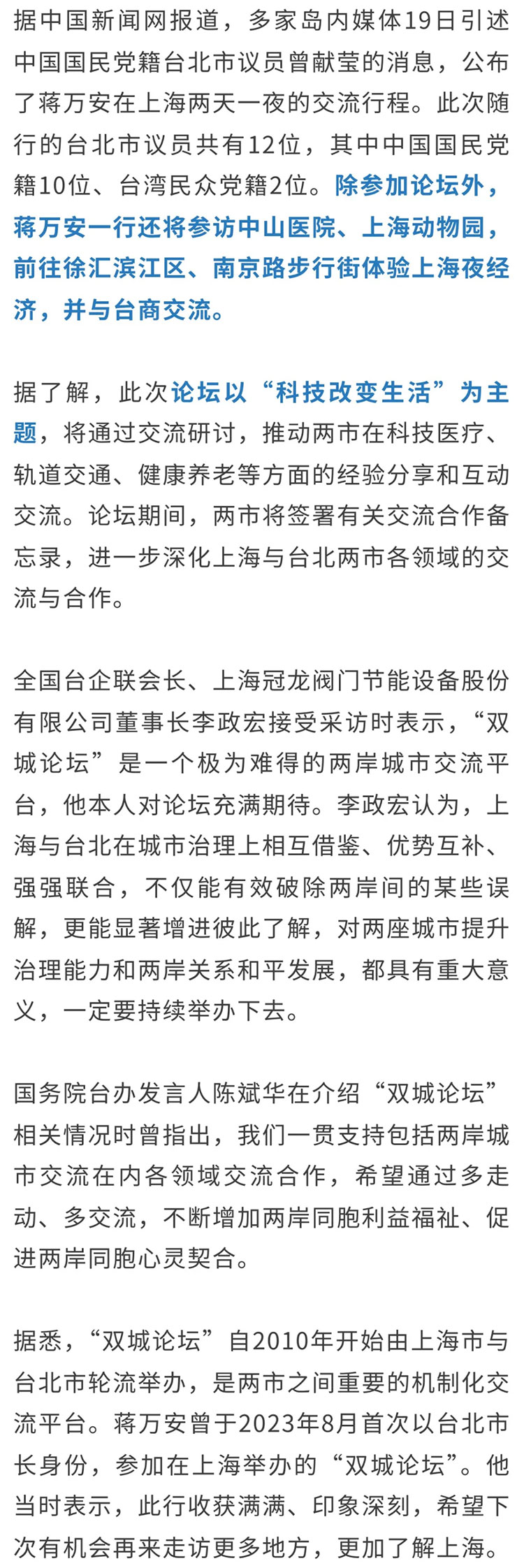 经上海与台北两市有关方面商定,“2025上海台北城市论坛”将于12月28日在上海举行。中国新闻网报道称,这也将是蒋万安第二次以台北市长身份率团赴上海交流。