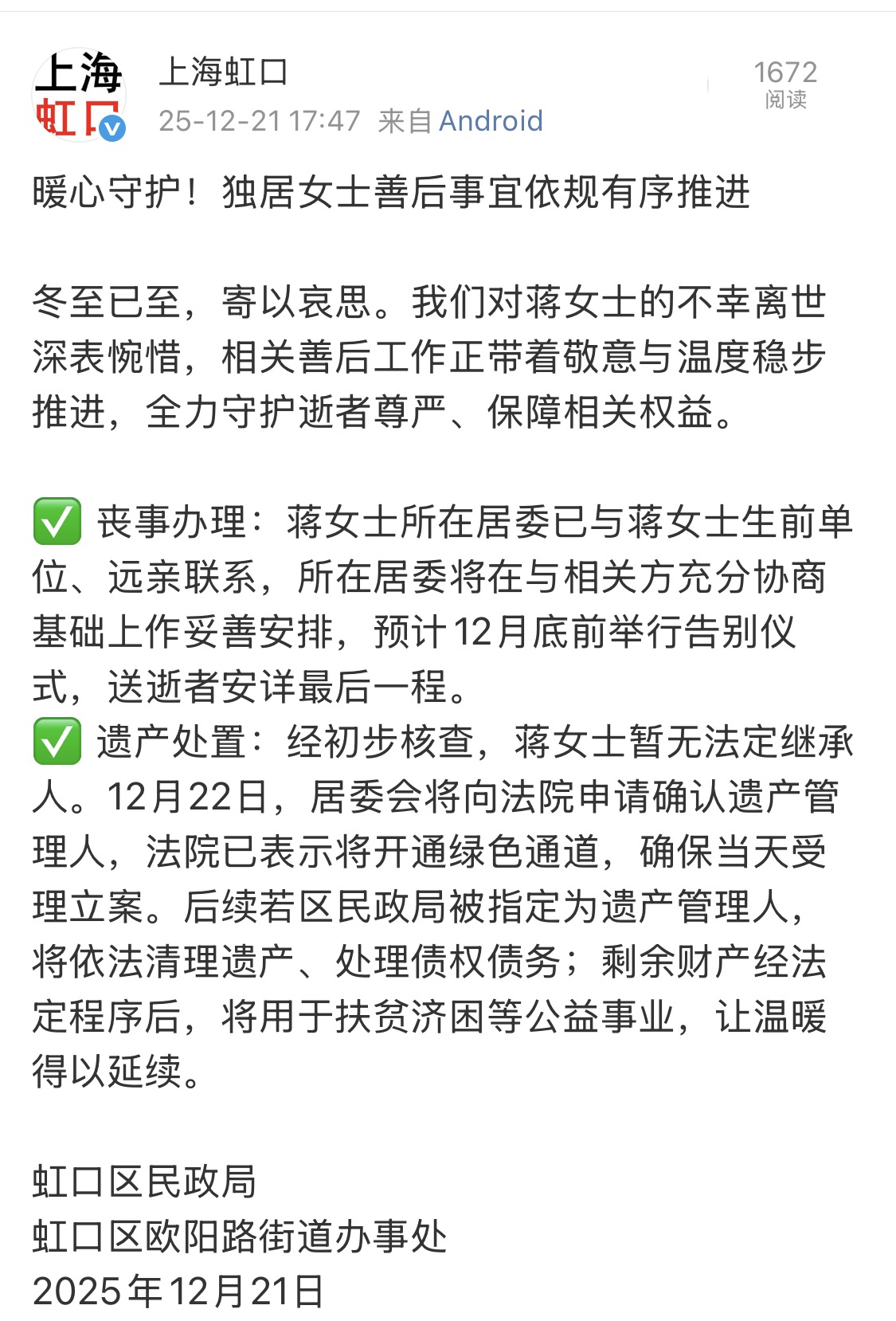 对此,@上海虹口 官方微博今日发布通报称,相关善后处置工作正在有序推进,相关部门将依法妥善处理各项事宜,切实维护逝者尊严,保障相关合法权益。