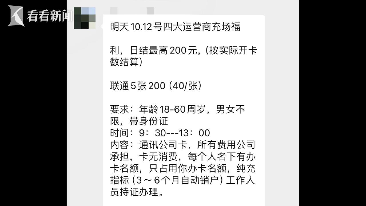 近日,有记者在网络上发现了“运营商充场办电话卡”的兼职招聘信息,以四五十元一张的价格吸引人们办理电话卡。记者根据信息加入了一个兼职群,发现要求“只占用办卡名额,所有费用公司承担”,并指定了办理地点。