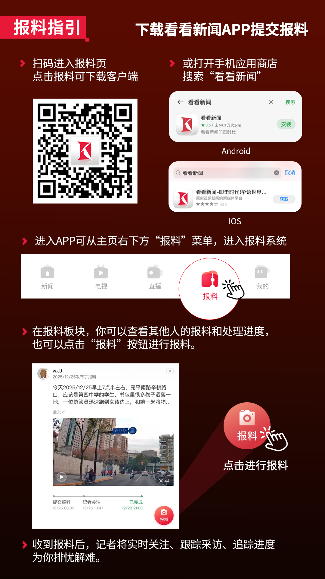 我们期待你继续通过看看新闻App“报料”功能,讲述你的见闻、提出你的疑问、贡献你的线索。你关心的,就是我们关注的;你报料的,就是我们追踪的。