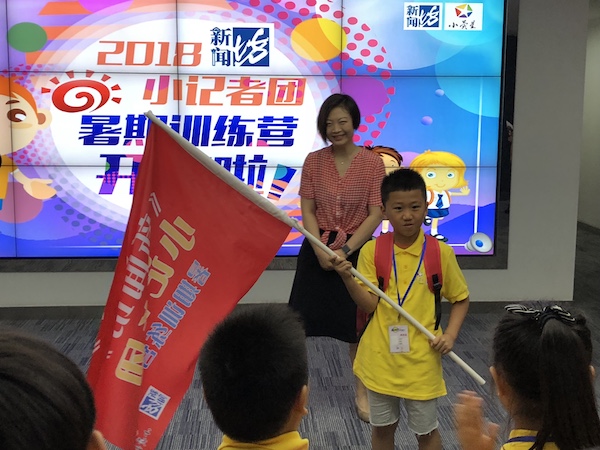 SMG融媒体中心通联新闻部主任魏颖老师为小记者授旗。小记者代表挥起开营团旗,标志着新闻梦的开启。