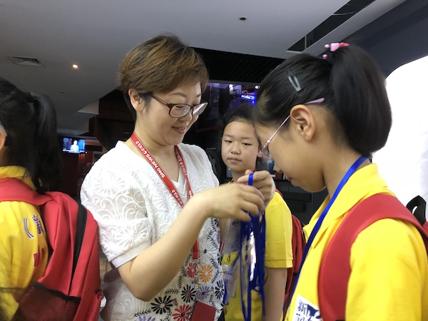 SMG融媒体中心通联新闻部新媒体主管籍明老师为小记者们戴上记者证。