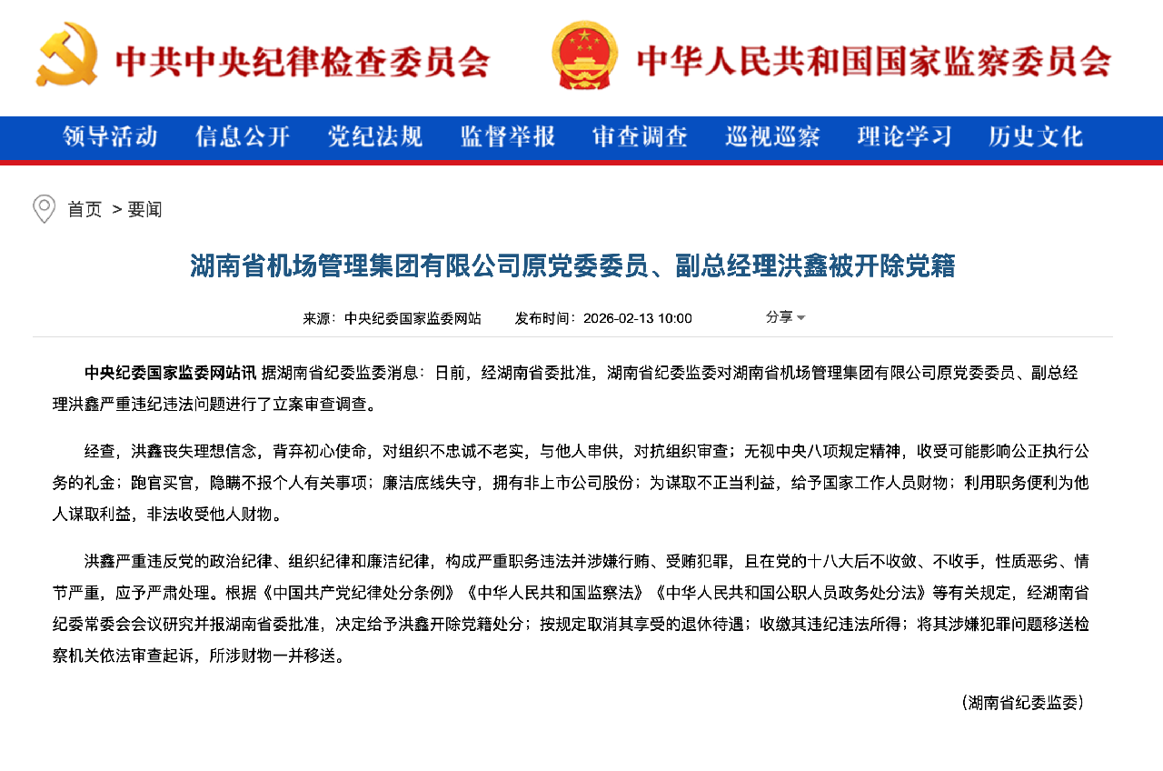 此前据澎湃新闻,2025年9月26日上午,湖南省纪委监委网站发布消息:湖南省机场管理集团有限公司原党委委员、副总经理洪鑫涉嫌严重违纪违法,目前正接受湖南省纪委监委纪律审查和监察调查。