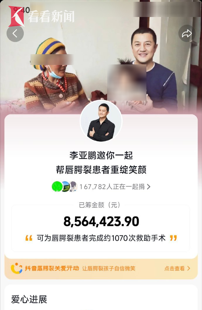 今天(1月16日)上午9点40分网络数据显示,一项由李亚鹏发起,167782人参与的唇腭裂关爱行动,正以每小时13万的速度涌入善款。目前已经筹得超过856万元的资金。如果后续募捐顺利,嫣然天使儿童医院将有望在三天后偿还此前拖欠的约2600万元的租金、物业费等款项。但短时募捐成功可能仍无法解决该医院长期运营问题。