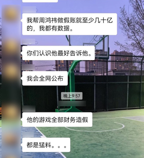 昨夜今晨,前360高级副总裁玉红在多个群聊中称:“帮周鸿祎做假账至少几十亿”,“游戏业务全部财务造假”,将“全网公布”。玉红还强调账号未被盗。随后该言论迅速发酵。