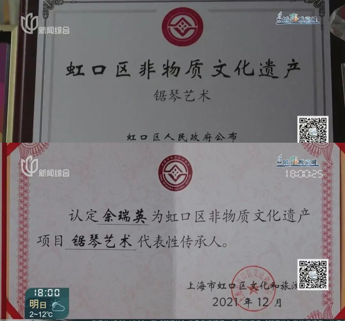 接过使命的佘瑞英,不仅自费定制了400把锯琴,更以全家之力,承担起了团队赴外交流、举办音乐会的全部费用。在她的奔走与坚守下,"锯琴艺术"于四年前成功申报虹口区非物质文化遗产,她本人也被认定为该项目的代表性传承人。