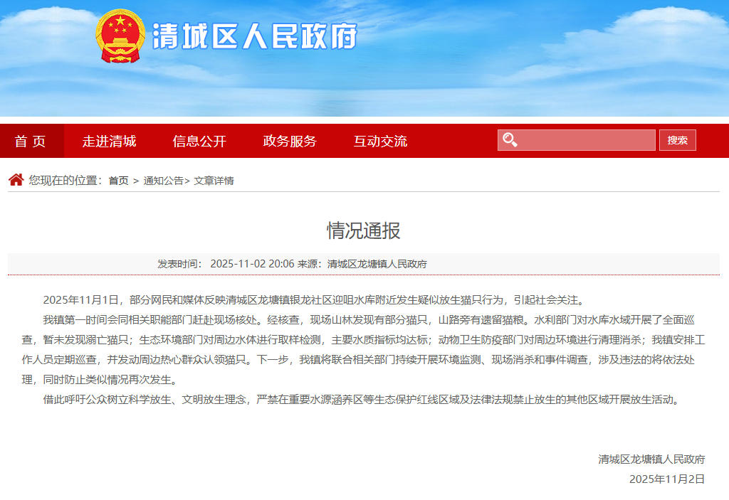 昨晚,清远市龙塘镇政府发布情况通报说,经核查,现场山林发现部分猫只,山路旁有遗留猫粮;水利部门对水库水域展开全面巡查,暂未发现溺亡猫只;生态环境部门对周边水体取样检测,主要水质指标都达标;动物卫生防疫部门对周边环境展开清理消杀;镇政府已经安排工作人员定期巡查并发动热心群众认领猫只。