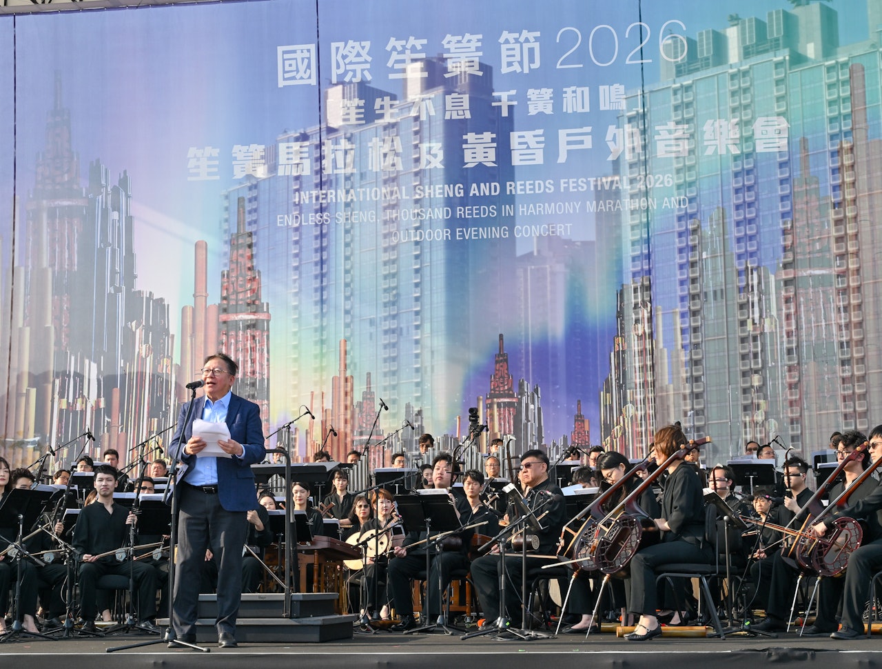 活动由”笙生不息——千簧和鸣“笙簧马拉松揭开序幕,主礼嘉宾包括文化体育及旅游局体育专员蔡健斌先生、启德体育园总监(策略发展)邓竟成先生、教育局总课程发展主任(艺术教育)陈家曦博士、香港旅游业议会副主席吴熹安先生、香港旅游促进会总干事崔定邦先生、香港中乐团理事会主席赖显荣律师等。