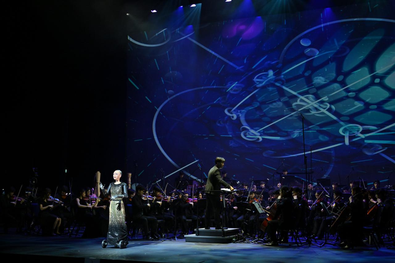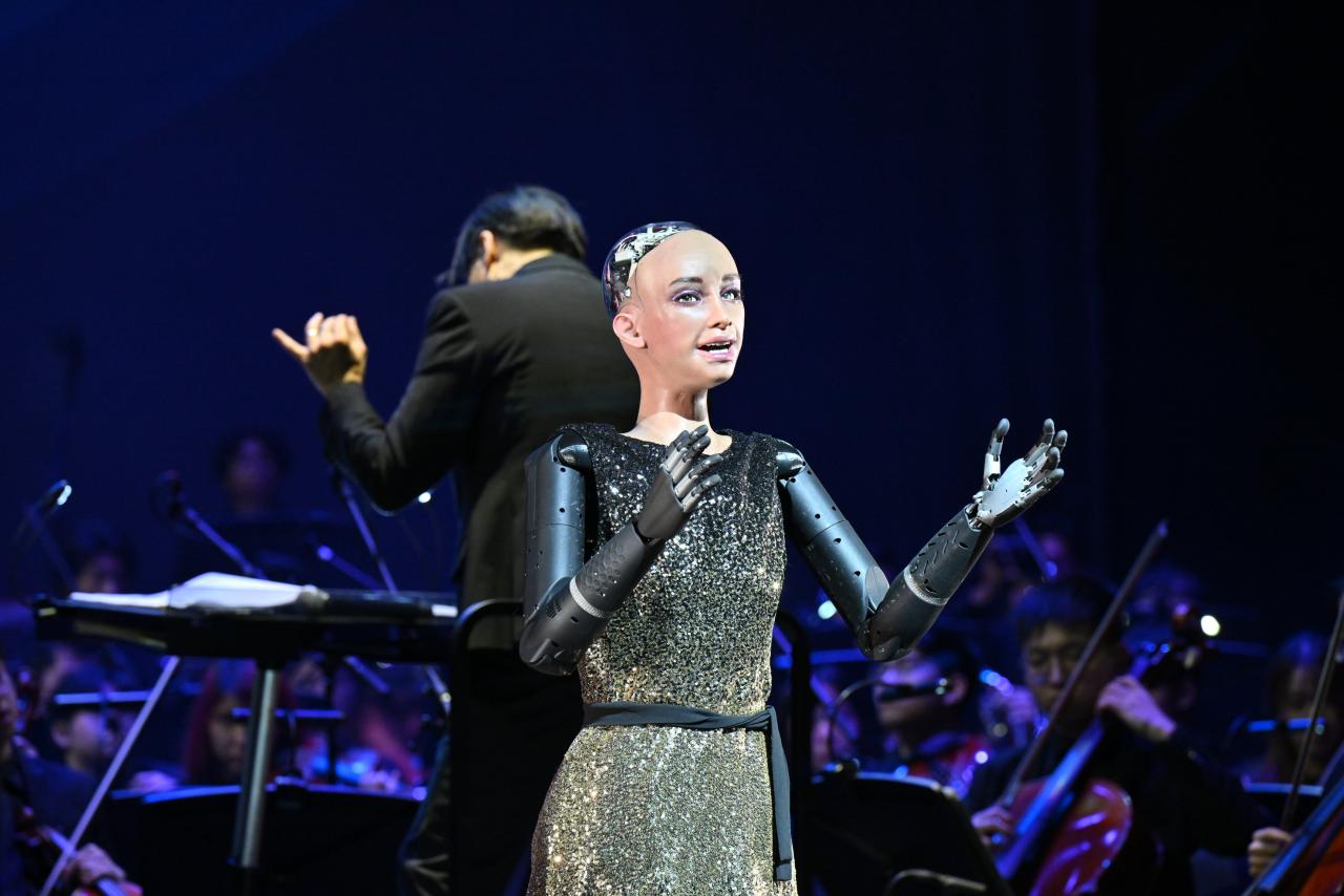 全场焦点是人形机器人Sophia的全球首演。由汉森机械人技术公司开发的Sophia首度以独唱家姿态登场,与乐团合作演绎三首原创歌曲。音乐学院林钧晖博士团队特别创作管弦乐助奏,探索人机音乐互动新维度,引领观众反思存在与真实。音乐会还大胆跨界,从经典电视剧《西游记》主题曲《云宫迅音》过渡至热门游戏《黑神话:悟空》主题,结合炫目视效与现场电竞画面,将怀旧与创新融为一体,掀起高潮。