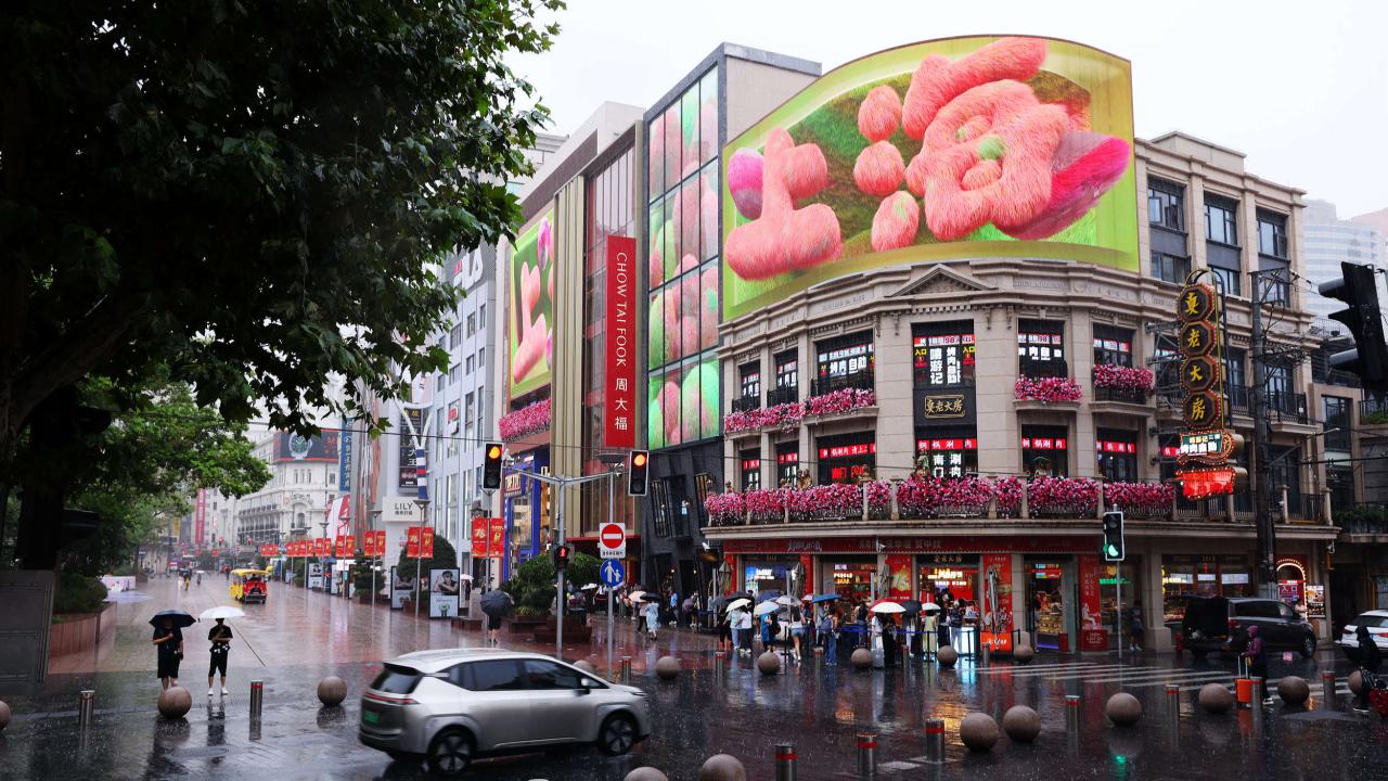 上午9点多,上海部分地区下起大雨。在枫泾服务区,市民游客匆匆进入稍作休息。
