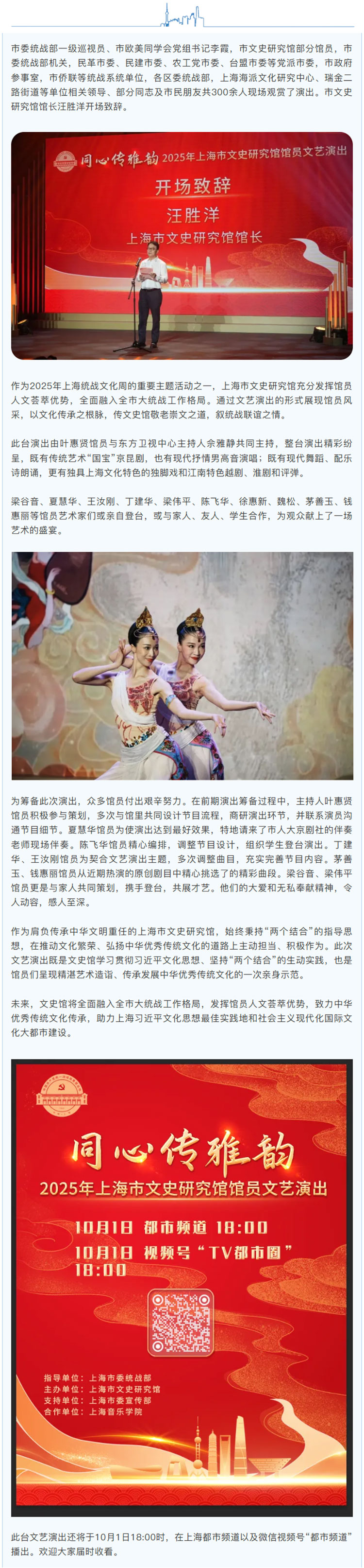 同心传雅韵,新声沐今辉。金风送爽、喜迎国庆之际,9月25日下午,“同心传雅韵——2025年上海市文史研究馆馆员文艺演出”在上海音乐学院贺绿汀音乐厅成功举办。此次文艺演出由上海市委统战部指导,上海市委宣传部支持,上海市文史研究馆与上海音乐学院合作举办。
